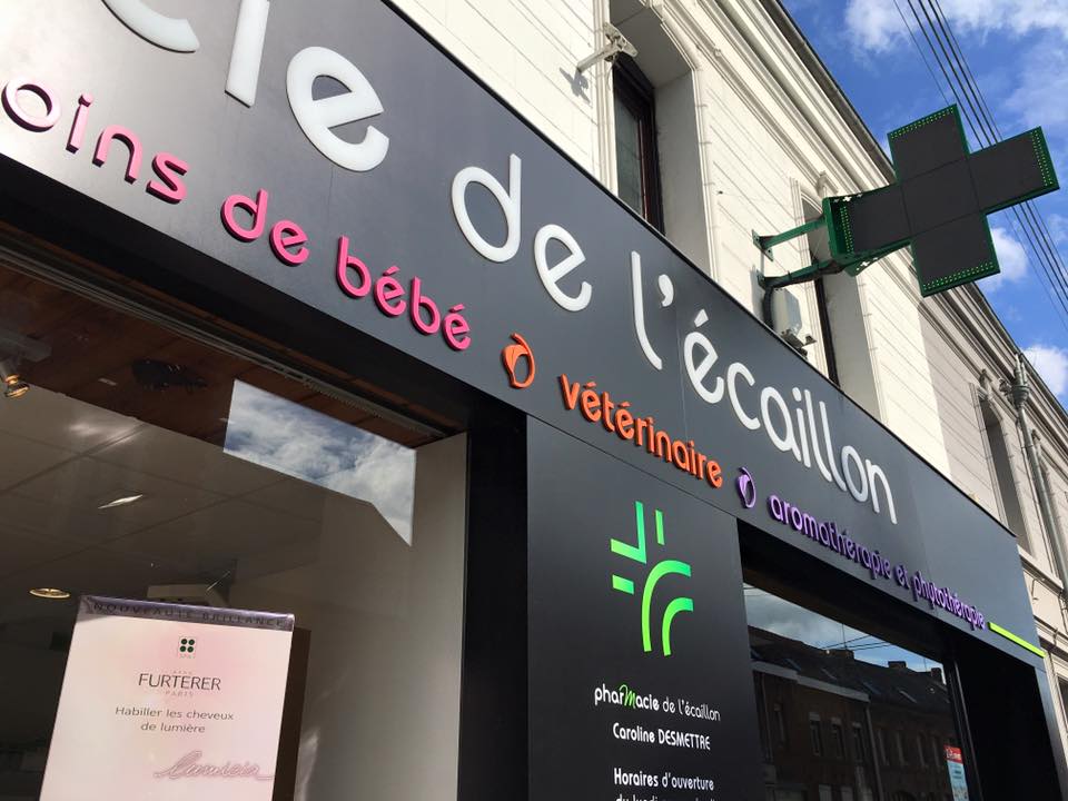 Pour cette pharmacie située à Thiant, notre équipe de créatifs a créé un ensemble d’enseigne sublimé ici par notre équipe de poseurs. Réalisation d’un squelette en acier traité antirouille, fabrication et pose d’un bardage plaques alu laquées noir mat, ajourées de lettres équipées de LEDS en éclairage direct et d’un ensemble de textes reprenant les services de l’officine, découpé au laser en PVC de couleurs différentes.